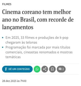 Leia a matéria em: https://www1.folha.uol.com.br/blogs/k-cultura/2025/12/cinema-coreano-tem-melhor-ano-no-brasil-com-recorde-de-lancamentos.shtml